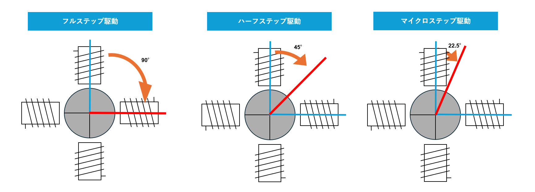 ステッピングモータを動かす際には、駆動方式ごとに特徴が異なる複数の制御手法があります。フルステップ駆動、ハーフステップ駆動、マイクロステップ駆動の3種類が代表的で、それぞれトルク、振動、滑らかさに違いがあります。ここでは各駆動方式の原理と制御信号の仕組みについて解説します。