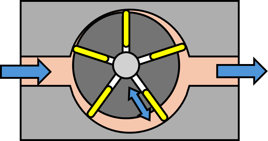 回転するロータに取り付けられた「ベーン(翼)」がスライドしながらケーシング内壁に密着し、密閉空間を形成して空気や油を吸入・圧縮・吐出する機構です。コンパクトな設計が可能なため、狭いスペースや軽負荷用途でも利用されています。