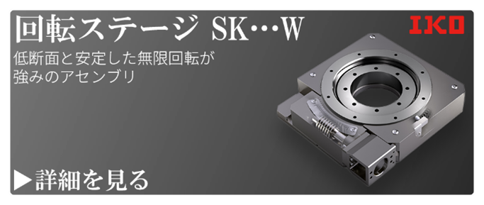 回転ステージSK…Wは、回転案内部にクロスローラベアリングを採用し、優れた剛性・低断面・無限回転を実現した回転ステージです。クロスローラベアリング自体がテーブルとなっているため、回転振れが非常に小さいです。テーブルや検査対象物を直接取り付けられるため、設計や組み付けにかかる工数を削減できます。