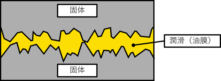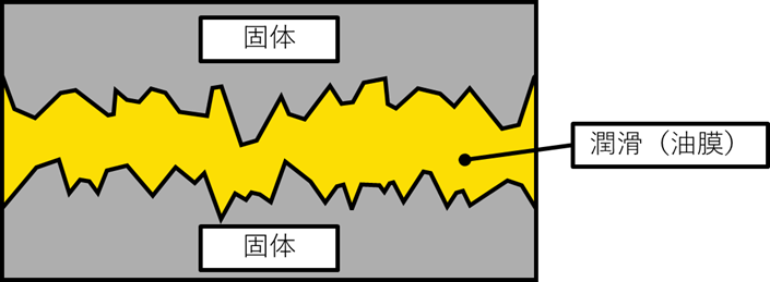 二つの表面に十分な油膜が形成され、固体同士が完全に分離した状態です。二つの物体の異なる速度の運動(相対運動)によって生じる油膜圧力が表面を支え、金属同士の直接接触を防ぎます。流体潤滑は摩擦係数が最も低く、理想的な潤滑状態と言えます。