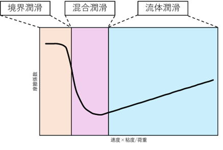潤滑の状態は、粘度、荷重、速度などの要因によって変化し、これらの関係はストライベック曲線で表せます。この曲線は、摩擦係数と「速度×粘度/荷重」の関係を示し、潤滑設計において重要な指標となります。